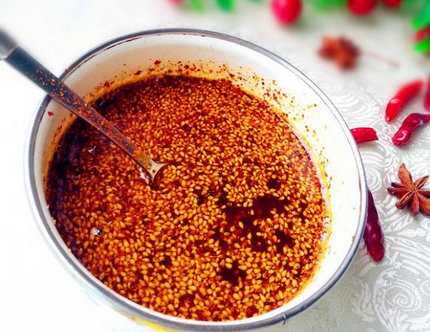 面皮的口味合不合心意,說的敞亮點全得靠辣椒油是否做的地道,傳統的陜西岐山辣椒油的做法是將三奈,八角、香果、桂皮、花椒,磨成很 細的粉末,配成調料面,然后開大火熱油,油燒十成熱離火放涼至五成熱時,將油倒入配好的辣椒粉末當中,加之食鹽攪拌,攪拌過程中倒入岐山用玉米、麥子、高粱等釀制的糧食醋數滴,再次攪拌均勻到辣椒不冒泡時,較好加入一些白糖攪拌。這樣,地道的岐山辣椒油就算做成啦。
